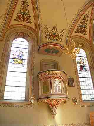 | Die Kirche ist reich bemalt und geschmückt. | Auf die Kanzel geht keiner mehr. |