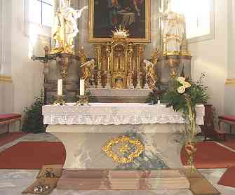 Der neugotische Hauptaltar - Aufbau wurde 1792 von Josef Klemens Witwer errichtet. Links steht die Hl. Notburga und rechts Hl. Isidor, im Giebel ist der Hl. Nikolaus mit Engeln zu sehen.